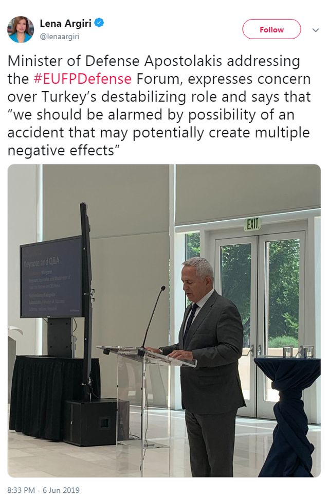 Μιλώντας στην Ουάσιγκτον, στο 8ο ετήσιο συνέδριο «EU and Foreign Policy Defence Forum 2019», ο Έλληνας υπουργός είπε ότι έθεσε στις επαφές του στο Κογκρέσο την αποσταθεροποιητική συμπεριφορά της Τουρκίας στην περιοχή.