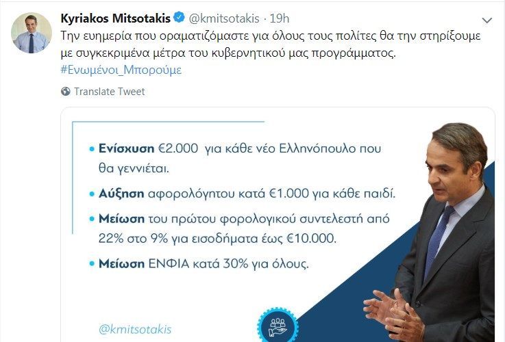 Με ανάρτησή του στο Twitter ο πρόεδρος της Νέας Δημοκρατίας, Κυριάκος Μητσοτάκης παραδέχεται άμεσα πλέον πως η πρόταση για μη μείωση του αφορολόγητου που είχε κάνει ένα μήνα πριν, ήταν απλό πυροτέχνημα.