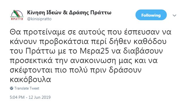 «Θα προτείναμε σε αυτούς που έσπευσαν να κάνουν προβοκάτσια περί δήθεν καθόδου του Πράττω με το Μερα25 να διαβάσουν προσεκτικά την ανακοίνωση μας και να σκέφτονται πιο πολύ πριν δράσουν κακόβουλα», αναφέρει το ΠΡΑΤΤΩ.