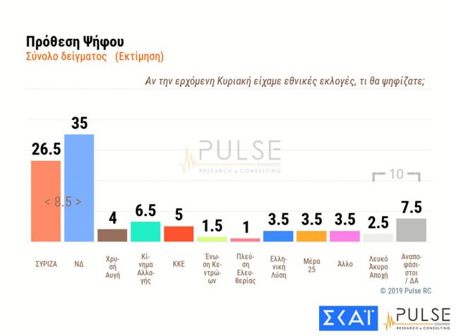 Προβάδισμα της Ν.Δ. έναντι του ΣΥΡΙΖΑ στις εθνικές εκλογές δίνει δημοσκόπηση που διενήργησε η εταιρεία Pulse για λογαριασμό του τηλεοπτικού σταθμού ΣΚΑΪ.