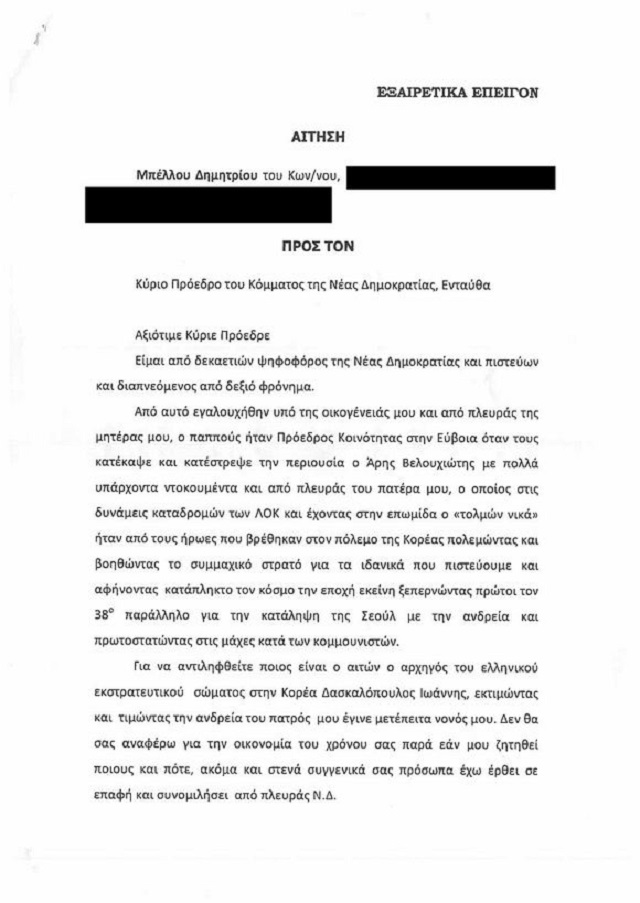 »Για να αντιληφθείτε ποιος είναι ο αιτών ο αρχηγός του ελληνικού εκστρατευτικού σώματος στην Κορέα, Δασκαλόπουλος Ιωάννης, εκτιμώντας και τιμώντας την ανδρεία του πατρός μου έγινε μετέπειτα νονός μου. Δεν θα σας αναφέρω για την οικονομία του χρόνου σας παρά εάν μου ζητηθεί ποιους και πότε, ακόμα και στενά συγγενικά σας πρόσωπα έχω έρθει σε επαφή και συνομιλήσει από πλευράς Ν.Δ.