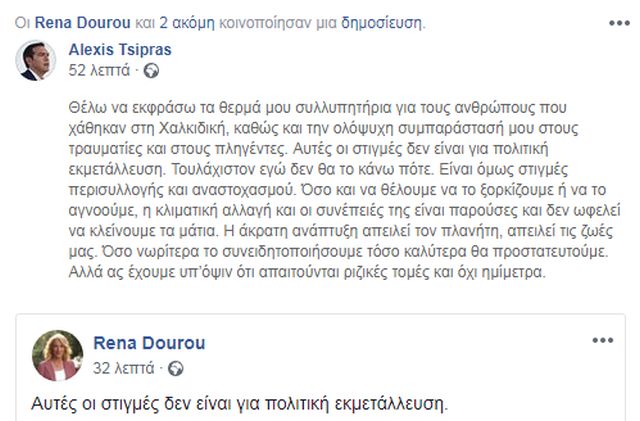 Με τη σειρά της η Ρένα Δούρου, αφού «μοιράστηκε» το μήνυμα του Αλέξη Τσίπρα, επανάλαβε την προτροπή του: «Αυτές οι στιγμές δεν είναι για πολιτική εκμετάλλευση».