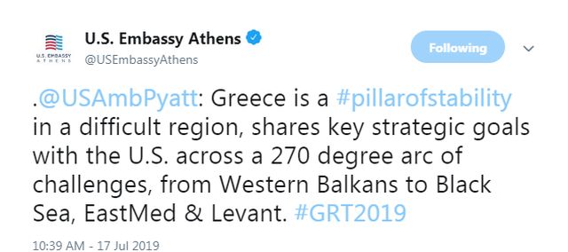 Η Ελλάδα πυλώνας σταθερότητας από τον Δούναβη και τον Εύξεινο Πόντο έως την Ανατολική Μεσόγειο και τη Μέση Ανατολή, διαμήνυσε ο Αμερικανός πρεσβευτής στην Αθήνα, Τζέφρι Πάιατ, καθιστώντας έτσι σαφή τον γεωπολιτικό ρόλο της χώρας μας «σε μια ευρύτερη περιοχή», σε ένα τόξο προκλήσεων 270 μοιρών.