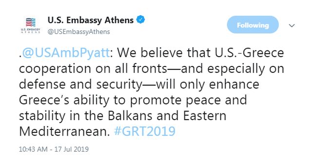 Πρόσθεσε ότι η συνεργασία ΗΠΑ-Ελλάδας σε όλα τα μέτωπα -και ειδικά στην άμυνα και την ασφάλεια- μόνο θα ενισχύσει την ικανότητα της Ελλάδας να προάγει την ειρήνη και τη σταθερότητα στα Βαλκάνια και την Ανατολική Μεσόγειο.