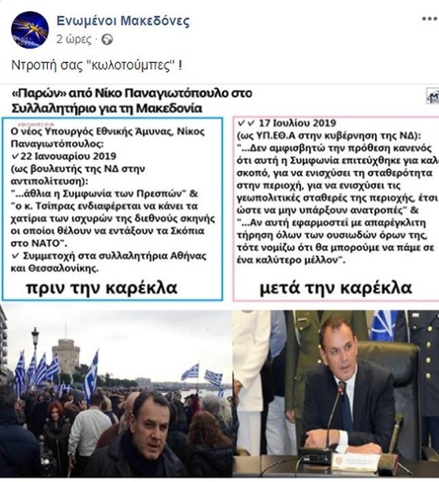 Στην σελίδα στο Facebook της εν λόγω ακροδεξιάς ομάδας, την οποίαν «ακολουθούν» σχεδόν 15.000 άτομα, ήδη έχουν ξεκινήσει οι πρώτες καταγγελίες για «κωλοτούμπα» του κυβερνώντος κόμματος, με αφορμή τις δηλώσεις του νέου υπουργού Άμυνας Νίκου Παναγιωτόπουλου, ο οποίος δήλωσε ότι «αν αυτή (σ.σ., η Συμφωνία των Πρεσπών) εφαρμοστεί με απαρέγκλιτη τήρηση όλων των ουσιωδών όρων της, τότε νομίζω ότι θα μπορούμε να πάμε σε ένα καλύτερο μέλλον».