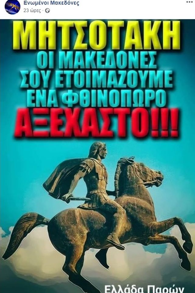 Σημειωτέον δε ότι η εν λόγω ακροδεξιά ομάδα απειλεί τον πρωθυπουργό με «ένα αξέχαστο Φθινόπωρο» λόγω της αλλαγής στάσης της ΝΔ προς τη Συμφωνία των Πρεσπών.