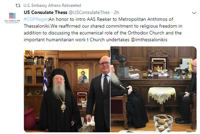 «Επαναβεβαιώσαμε την κοινή δέσμευσή μας στη θρησκευτική ελευθερία και συζητήσαμε παράλληλα τον οικουμενικό ρόλο της Ορθόδοξης Εκκλησίας και το σημαντικό ανθρωπιστικό έργο της», αναφέρει ο κ. Φλέγκερ σε ανάρτησή του στον λογαριασμό του προξενείου στο Twitter για την επίσκεψη του ίδιου και του κ. Ρίκερ στην Ιερά Μητρόπολη Θεσσαλονίκης, όπου έγιναν δεκτοί από τον κ. Άνθιμο.