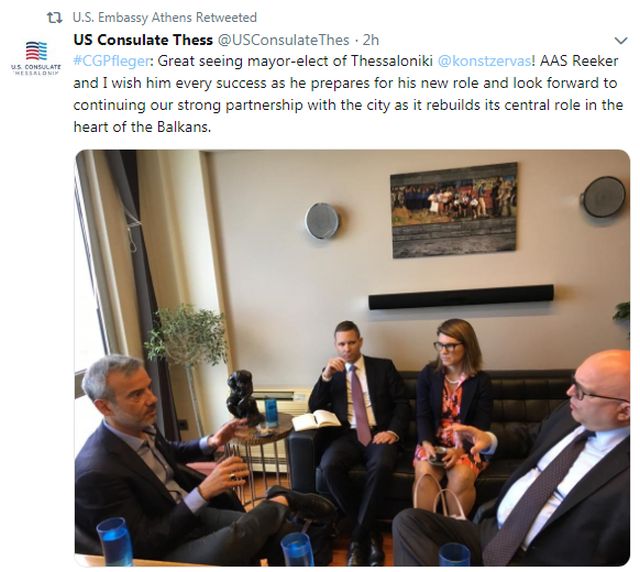Σε ό,τι αφορά, δε, τη συνάντηση με τον κ. Ζέρβα, σε άλλο tweet σημειώνεται πως οι κ.κ. Ρίκερ και Φλέγκερ ευχήθηκαν στο νέο δήμαρχο Θεσσαλονίκης κάθε επιτυχία καθώς ετοιμάζεται να αναλάβει το νέο του ρόλο.