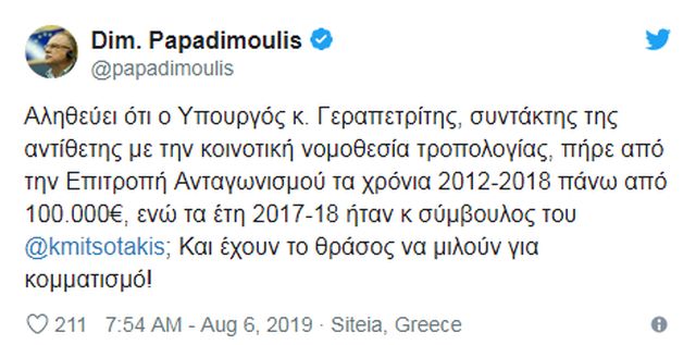 «Αληθεύει ότι ο υπουργός κ. Γεραπετρίτης, συντάκτης της αντίθετης με την κοινοτική νομοθεσία τροπολογίας, πήρε από την Επιτροπή Ανταγωνισμού τα χρόνια 2012-2018 πάνω από 100.000 ευρώ, ενώ τα έτη 2017-18 ήταν και σύμβουλος του Κ. Μητσοτάκη;