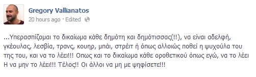 “…Υπερασπίζομαι το δικαίωμα κάθε δημότη και δημότισσας(!!), να είναι αδελφή, γκέουλας, λεσβία, τρανς, κουηρ, μπάι, στρέιτ ή όπως αλλοιώς ποθεί η ψυχούλα του της του, και να το λέει!!! Οπως και το δικαίωμα κάθε οροθετικού όπως εγώ, να το λέει Η να μην το λέει!!! Τέλος!! Οι άλλοι να μη με ψηφίσετε!!!”.
