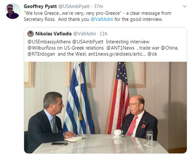 «Αγαπάμε την Ελλάδα… Είμαστε πολύ, πολύ υπέρ της Ελλάδας» – ένα καθαρό μήνυμα από τον υπουργό Ρος», η ανάρτηση του κ. Πάιατ.