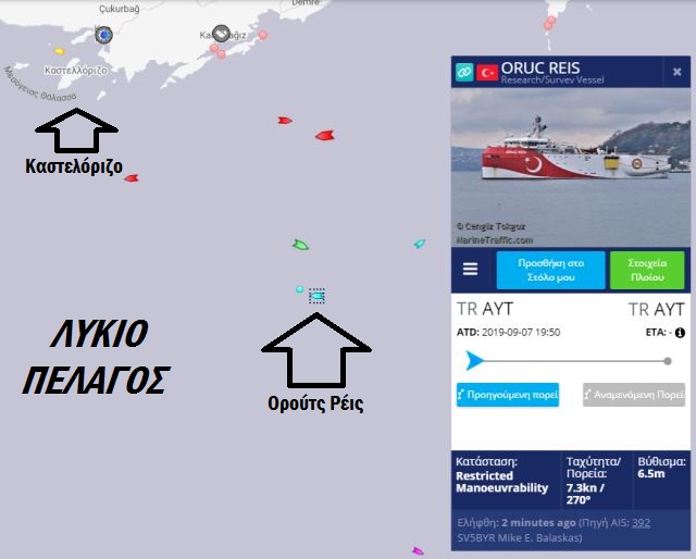 Στα νοτιοανατολικά του Καστελόριζου πλέει το τουρκικό ερευνητικό σκάφος «Ορούτς Ρέις» (ORUÇ REİS).
