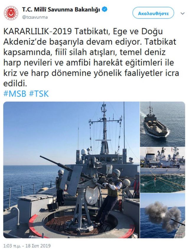 Η Τουρκία έδωσε στη δημοσιότητα φωτογραφίες από την άσκηση «Αποφασιστικότητα 2019» που διεξάγεται σε Αιγαίο και Ανατολική Μεσόγειο.
