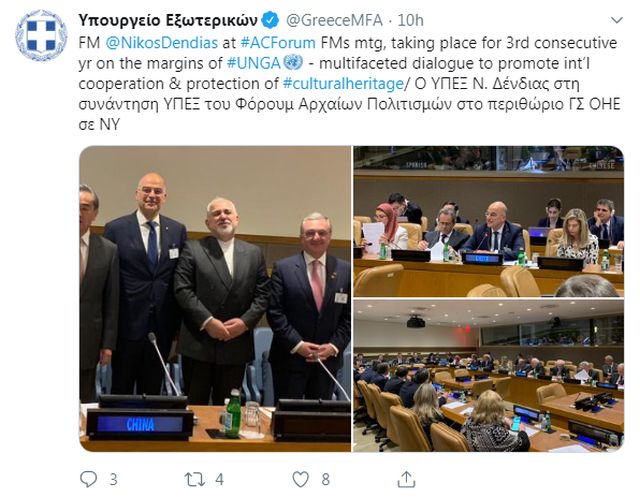 Σχετικά με τη συνάντηση που είχαν οι υπουργοί Εξωτερικών των χωρών που συμμετέχουν στο Φόρουμ των Αρχαίων Πολιτισμών, ο Έλληνας υπουργός είπε ότι η συγκεκριμένη πρωτοβουλία «δείχνει ότι αυτό που λέμε ήπια ισχύς, δηλαδή την δυνατότητα της κουλτούρας και του πολιτισμού να παίζουν ρόλο, είναι κάτι απτό και σημαντικό».