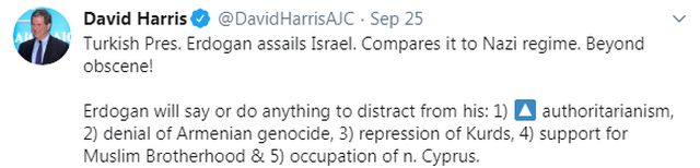 «Ο Ερντογάν θα πει ή θα κάνει οτιδήποτε για να αποσπάσει την προσοχή από: 1) τον αυταρχισμό, 2) την άρνηση της γενοκτονίας των Αρμενίων, 3) την καταστολή των Κούρδων, 4) την υποστήριξη της Μουσουλμανικής Αδελφότητας και 5) Κύπρο».