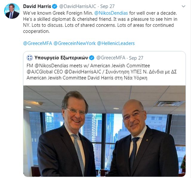 Με τον επικεφαλής της Αμερικανοεβραϊκής Επιτροπής (American Jewish Committee – AJC), Ντέιβιντ Χάρις, συναντήθηκε στο περιθώριο της Γενικής Συνέλευσης του ΟΗΕ ο Νίκος Δένδιας.