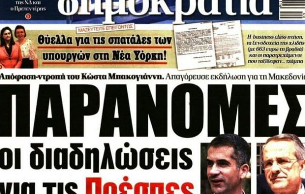 Δεν κρατιέται η δεξιά εφημερίδα «Δημοκρατία». Σήμερα Δευτέρα εξαπολύει πρωτοσέλιδη επίθεση στην κυβέρνηση και στον Κώστα Μπακογιάννη επειδή «απαγόρευσε εκδήλωση για τη Μακεδονία».