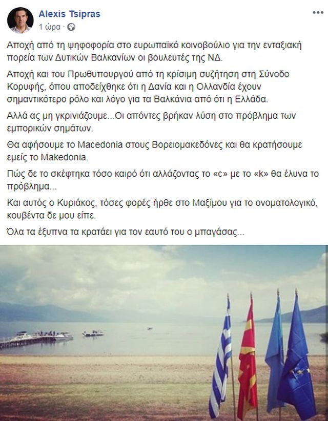 «Θα αφήσουμε το Macedonia στους Βορειομακεδόνες και θα κρατήσουμε εμείς το Makedonia. Πώς δε το σκέφτηκα τόσο καιρό ότι αλλάζοντας το “c” με το “k” θα έλυνα το πρόβλημα…», σχολιάζει ο Αλέξης Τσίπρας με ανάρτησή του στο Facebook.