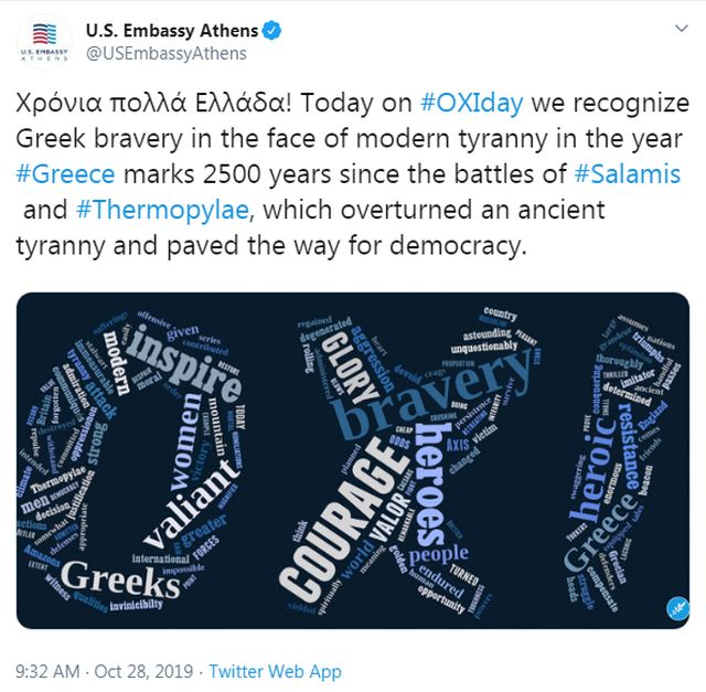 «Χρόνια πολλά Ελλάδα!», ξεκινά το tweet με το μήνυμα για την 28η Οκτωβρίου της Αμερικανικής Πρεσβείας και συνεχίζει:
