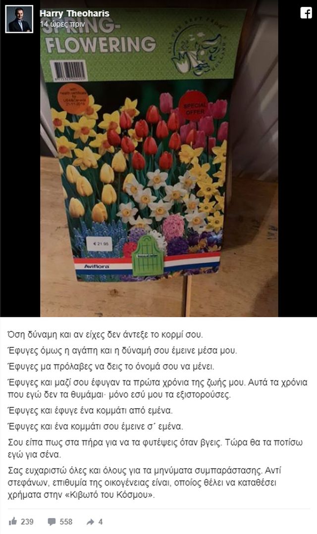 »Τώρα θα τα ποτίσω εγώ για σένα» έγραψε ο κ. Θεοχάρης.