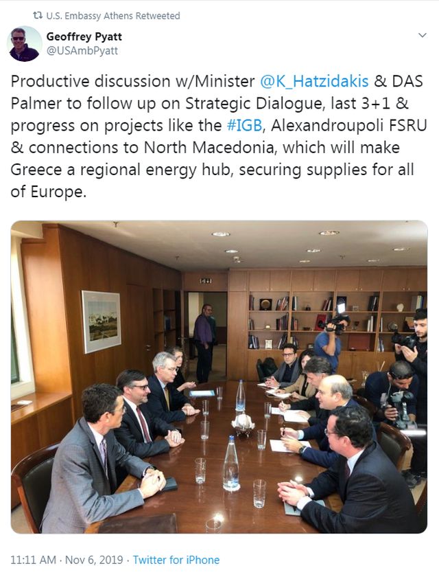 Η συνάντηση με τον υφυπουργό Πάλμερ έγινε σε συνέχεια του Στρατηγικού Διαλόγου και της τελευταίας 3+1 (Ενεργειακή Υπουργική Διάσκεψη Ελλάδας, Κύπρου, Ισραήλ και ΗΠΑ την Τετάρτη 7 Αυγούστου 2019), συζητήθηκε η πρόοδος σε έργα όπως ο αγωγός IGB, η πλωτή εξέδρα υγροποιημένου αερίου (FSRU) στην Αλεξανδρούπολη και συνδέσεις με τη Βόρεια Μακεδονία, που θα καταστήσουν την Ελλάδα περιφερειακό ενεργειακό κόμβο, εξασφαλίζοντας προμήθειες για όλη την Ευρώπη, όπως έγραψε ο κ. Πάιτ.