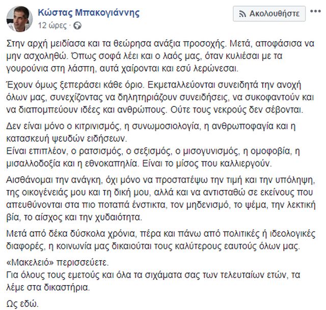 Μάλιστα ο κ. Μπακογιάννης αναφέρει πως για χρόνια είχε αποφασίσει να μην ασχοληθεί με όσα έγραφαν, ωστόσο αισθάνεται πλέον την ανάγκη να προστατέψει την τιμή και την υπόληψη, της οικογένειάς του και τη δική του.