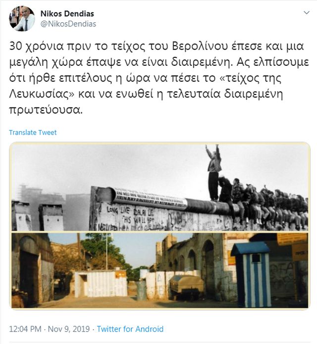 Ο υπουργός Εξωτερικών Νίκος Δένδιας, με ανάρτησή του στο Twitter επί τη ευκαιρία της επετείου της πτώσης του τείχους του Βερολίνου, έγραψε ότι ήρθε η ώρα να πέσει και το τείχος της Λευκωσίας.