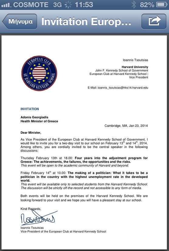 Η ουσία είναι ότι ο υπουργός επιβεβαιώνει με την πρόσκληση που δημοσιοποίησε, όλα τα ρεπορτάζ των προηγούμενων ημερών ότι τον κάλεσε το European club of Harvard Kennedy School και συγκεκριμένα ο αντιπρόεδρος του club Ιωάννης Τσούτσιας.