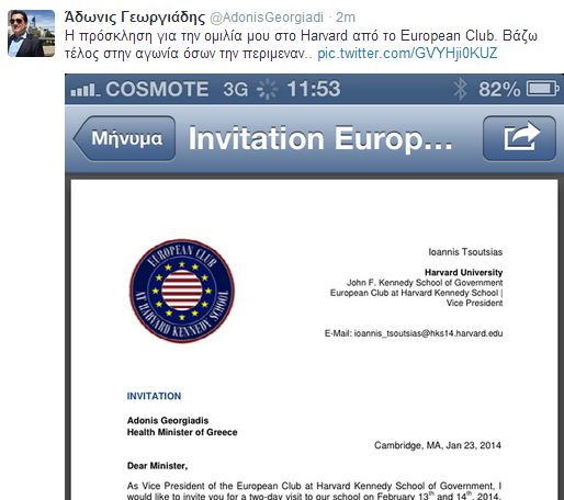 Ο Άδωνις Γεωργιάδης πρίν από λίγο μέσω twitter έδωσε στη δημοσιότητα την πρόσκληση που έλαβε από το Χάρβαρντ γράφοντας στο λογαριασμό του “Η πρόσκληση για την ομιλία μου στο Harvard από το European Club. Βάζω τέλος στην αγωνία όσων την περιμεναν..”.