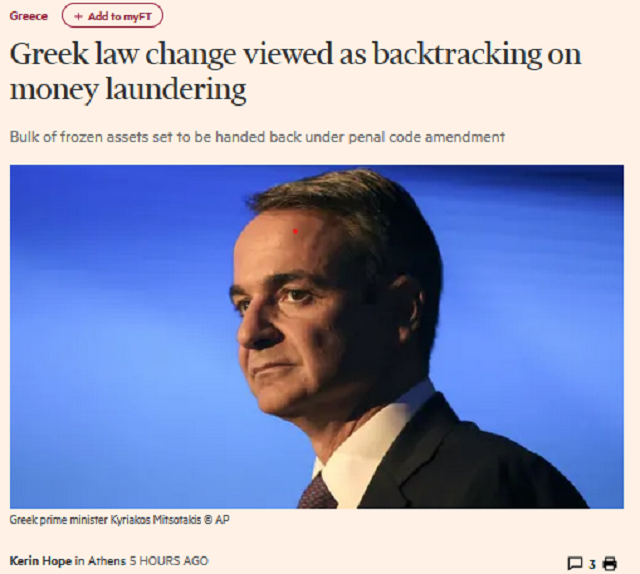 »Σήμερα επιβεβαιωνόμαστε. Οι Financial Times δημοσιεύουν ρεπορτάζ με τίτλο «Διάταξη που θεωρείται πισωγύρισμα για την καταπολέμηση του ξεπλύματος μαύρου χρήματος».