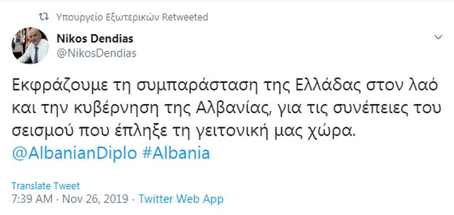 Ο υπουργός Εξωτερικών Νίκος Δένδιας, με ανάρτησή του στο Twitter, εξέφρασε τη συμπαράσταση της Ελλάδας στον αλβανικό λαό μετά τον ισχυρό σεισμό των 6,4 Ρίχτερ, που έχει προκαλέσει τρομερές καταστροφές στην κεντρική Αλβανία.