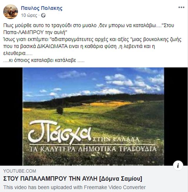 Με μία ανάρτησή του στο Facebook που συνοδευόταν από το τραγούδι «Στου Παπα-Λάμπρου την αυλή» απάντησε εμμέσως ο Παύλος Πολάκης στα «φίλια πυρά» που δέχθηκε με αιχμή τα όσα έγραψε για την Εθνική Συντονίστρια για τα ασυνόδευτα προσφυγόπουλα, Ειρήνη Αγαπηδάκη.