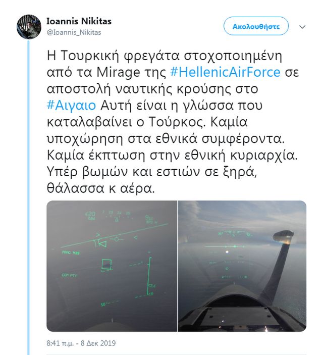 «Η Τουρκική φρεγάτα στοχοποιημένη από τα Mirage της #HellenicAirForce σε αποστολή ναυτικής κρούσης στο #Αιγαιο Αυτή είναι η γλώσσα που καταλαβαίνει ο Τούρκος.