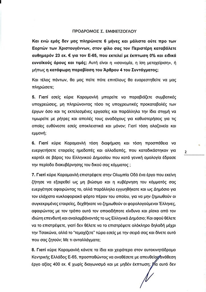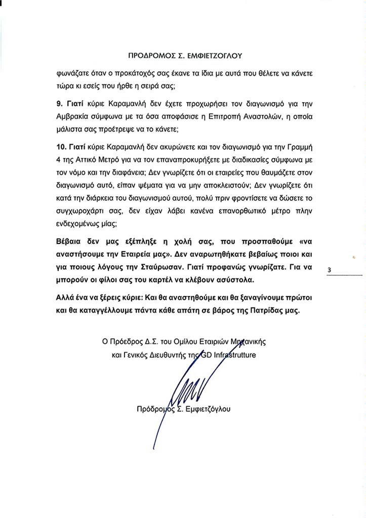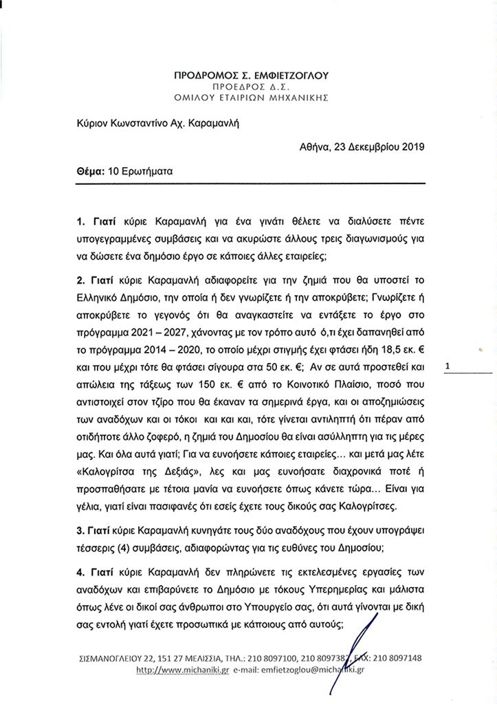 Συνέχεια στον ακήρυχτο πόλεμο μεταξύ του επιχειρηματία και προέδρου του ομίλου εταιρειών «Μηχανική», Πρόδρομου Εμφιετζόγλου με τον υπουργό Υποδομών και Μεταφορών, Κώστα Καραμανλή έδωσε τη Δευτέρα 23 Δεκεμβρίου ο επιχειρηματίας με επιστολή η οποία περιλαμβάνει 10 ερωτήματα και πολλές καταγγελίες.