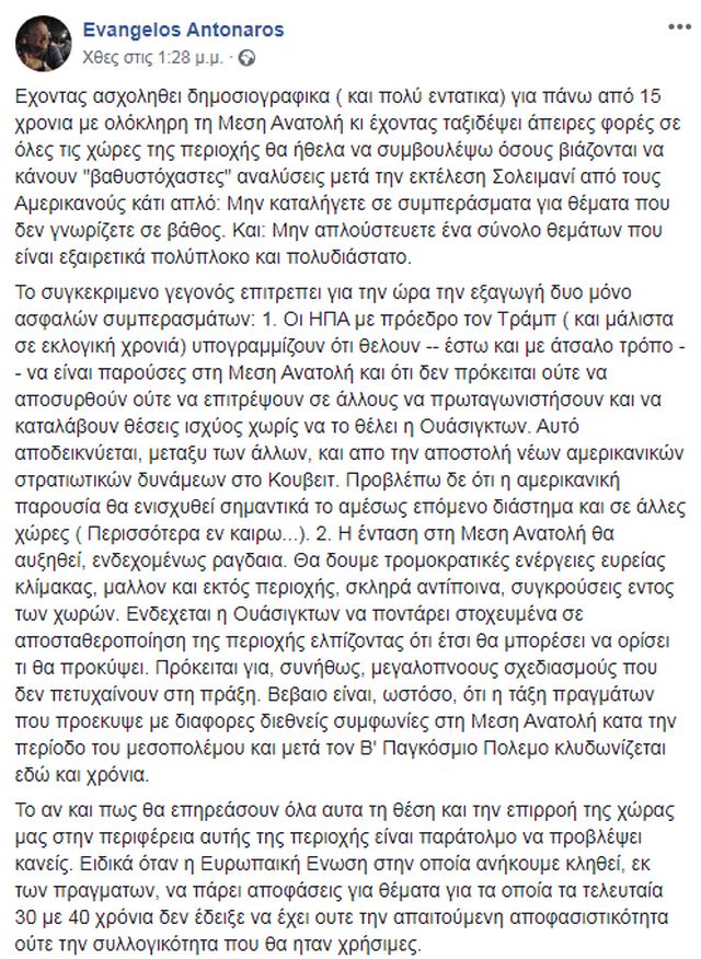 Την εκτίμηση του ότι μετά τον θάνατο του Σολεϊμανί θα υπάρξουν τρομοκρατικές ενέργειες, σκληρά αντίποινα, συγκρούσεις και εκτός Μ. Ανατολή εξέφρασε ο Ευάγγελος Αντώναρος με ανάρτηση του στο Facebook επισημαίνοντας δύο ασφαλή κατά τη γνώμη του συμπεράσματα.
