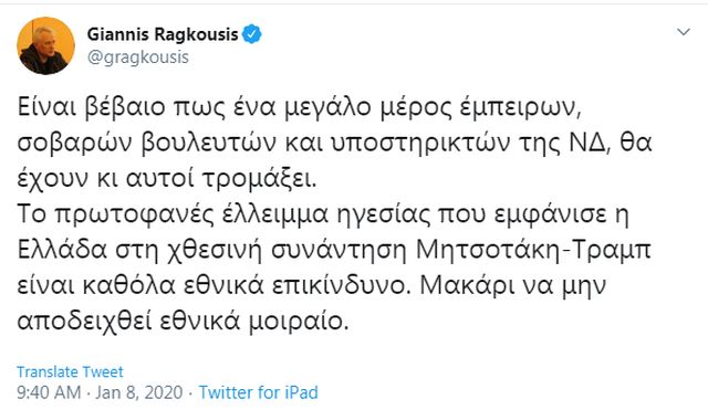 «Το πρωτοφανές έλλειμμα ηγεσίας που εμφάνισε η Ελλάδα στη χθεσινή συνάντηση Μητσοτάκη-Τραμπ είναι καθόλα εθνικά επικίνδυνο», πρόσθεσε ο κ. Ραγκούσης και κατέληξε: