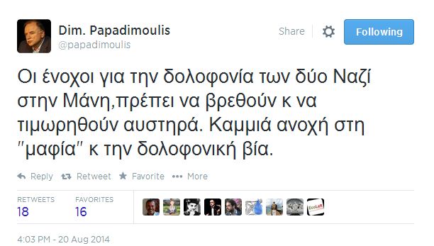 Για μια ακόμη φορά ο Δημήτρης Παπαδημούλης κατάφερε να προκαλέσει μπάχαλο και νέους πονοκεφάλους στον ΣΥΡΙΖΑ, με τις παρορμητικές αναρτήσεις του στο twitter. Ο ευρωβουλευτής, αναφερόμενος στη δολοφονία των δύο νέων στη Μάνη, έγραψε στο twitter: “Οι ένοχοι για την δολοφονία των δύο Ναζί στην Μάνη, πρέπει να βρεθούν κ να τιμωρηθούν αυστηρά. Καμμία ανοχή στη “μαφία” και την δολοφονική μανία”.