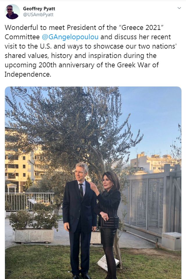 Σε σχετική ανάρτησή του στο τουίτερ, ο κ. Πάιατ ανέφερε ότι συζήτησαν με την κυρία Αγγελοπούλου για την πρόσφατη επίσκεψή της στις ΗΠΑ, καθώς και τρόπους με τους οποίους μπορεί να παρουσιαστούν οι κοινές αξίες, η ιστορία και η έμπνευση των δύο χωρών κατά τη διάρκεια της επερχόμενης 200ής επετείου από τον Αγώνα της Ελλάδας για Ανεξαρτησία.