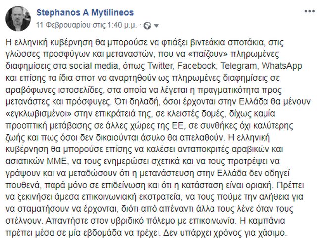 «Η ελληνική κυβέρνηση θα μπορούσε να φτιάξει βιντεάκια σποτάκια, στις γλώσσες προσφύγων και μεταναστών, που να «παίζουν» πληρωμένες διαφημίσεις στα social media, όπως Twitter, Facebook, Telegram, WhatsApp και επίσης τα ίδια σποτ να αναρτηθούν ως πληρωμένες διαφημίσεις σε αραβόφωνες ιστοσελίδες, στα οποία να λέγεται η πραγματικότητα προς μετανάστες και πρόσφυγες.