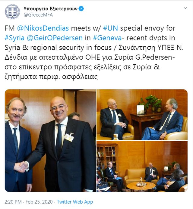 Η κατάσταση στη Συρία, υπό το πρίσμα και των τελευταίων εξελίξεων και οι προεκτάσεις της συνεχιζόμενης κρίσης στη σταθερότητα της περιοχής, συζητήθηκαν στη συνάντηση που είχε στη Γενεύη με τον ειδικό εκπρόσωπο του γγ του ΟΗΕ για τη Συρία, Γκάιρ Πέντερσεν, ο υπουργός Εξωτερικών Νίκος Δένδιας.