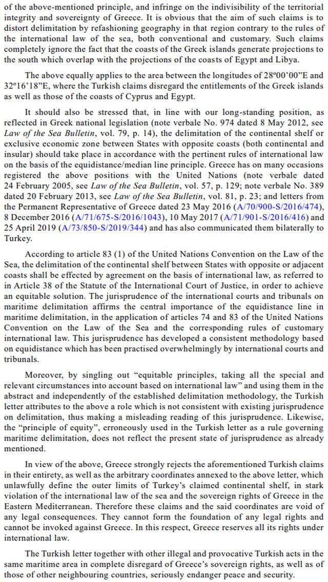 Συνοψίζοντας, με βάση τα παραπάνω, η Ελλάδα απορρίπτει έντονα τις προαναφερθείσες τουρκικές διεκδικήσεις στο σύνολό τους, καθώς και τις αυθαίρετες συντεταγμένες που επισυνάπτονται στην παραπάνω επιστολή, οι οποίες παρανόμως καθορίζουν τα εξωτερικά όρια της ισχυριζόμενης υφαλοκρηπίδας της Τουρκίας, με αυστηρή παραβίαση του διεθνούς δικαίουτης θάλασσας και των κυριαρχικών δικαιωμάτων της Ελλάδας στην Ανατολική Μεσόγειο.