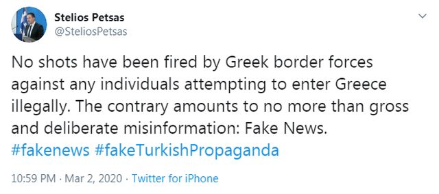 «Οι ελληνικές συνοριακές δυνάμεις δεν έχουν ανοίξει πυρ ενάντια σε άτομα που επιχειρούν να εισέλθουν παράνομα στην Ελλάδα.