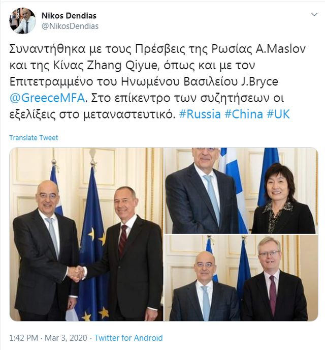 Ο Νίκος Δένδιας συναντήθηκε επίσης με τους πρέσβεις της Ρωσίας, της Κίνας και με τον Επιτετραμμένο του Ηνωμένου Βασιλείου και συζήτησε μαζί τους τις εξελίξεις στο μεταναστευτικό.