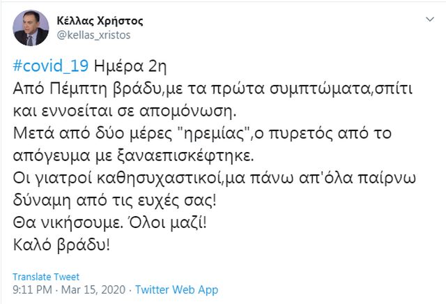 Μιλώντας την Κυριακή στον ραδιοφωνικό σταθμό ΘΕΜΑ 104,6 και στους Μάκη Πολλάτο και Βασίλη Αναστασόπουλο, ο κ. Κέλλας περιέγραψε ότι επέστρεψε στη Λάρισα από την Αθήνα το βράδυ της περασμένης Πέμπτης και αισθάνθηκε ατονία.
