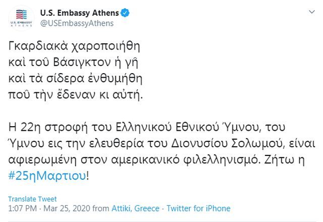 »Ζήτω η #25ηΜαρτιου!», καταλήγει η ανάρτηση της Αμερικανικής Πρεσβείας.