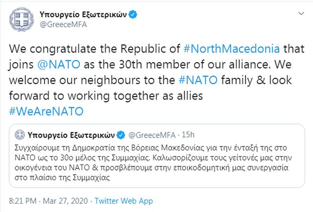 «Συγχαίρουμε τη Δημοκρατία της Βόρειας Μακεδονίας για την ένταξή της στο ΝΑΤΟ ως το 30ο μέλος της Συμμαχίας.