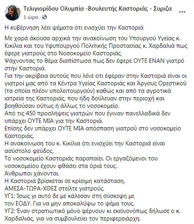 «Με χαρά άκουσα αρχικά την ανακοίνωση του Υπουργού Υγείας κ. Κικίλια και του Υφυπουργού Πολιτικής Προστασίας κ. Χαρδαλιά πως έφερε γιατρούς στο Νοσοκομείο Καστοριάς», γράφει σε ανάρτησή της στο Facebook η κ. Τελιγιορίδου, που είναι βουλευτής Καστοριάς.
