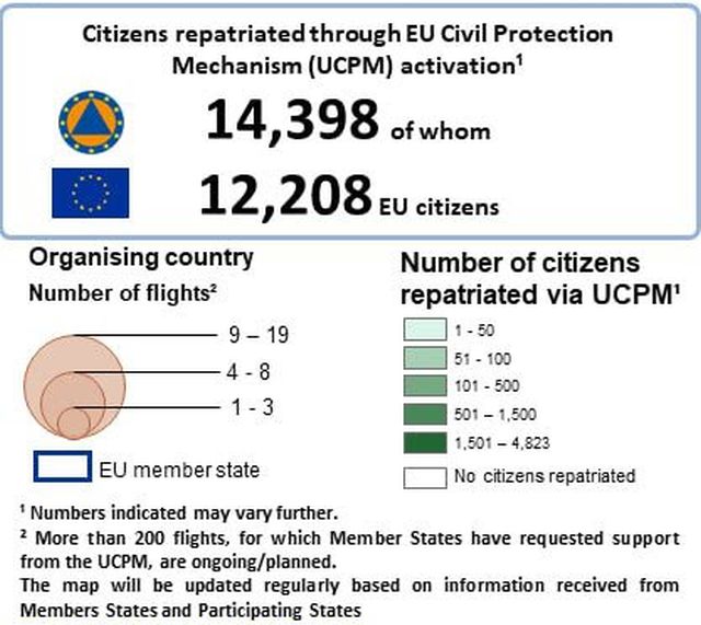 Με τη συνδρομή του Ευρωπαϊκού Μηχανισμού Πολιτικής Προστασίας, έχουν ήδη επαναπατριστεί από τρίτες χώρες πάνω από 12000 Ευρωπαίοι πολίτες, ενώ πάνω από 200 ακόμα πτήσεις αναμένεται να πραγματοποιηθούν το επόμενο διάστημα.