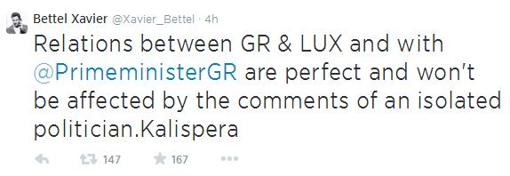 «Οι σχέσεις μεταξύ της Ελλάδας και του Λουξεμβούργου και με τον Έλληνα Πρωθυπουργό είναι εξαιρετικές και δεν επηρεάζονται από τα σχόλια ενός μεμονωμένου πολιτικού. Καλησπέρα» έγραψε ο Ξαβιέ Μπέτελ.