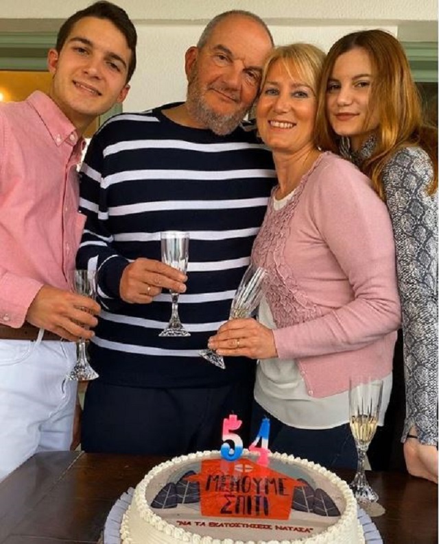 Αδυνατισμένος με μούσι και με ένα απλό ριγέ t-shirt ποζάρει ανάμεσα στη σύζυγό του και στα παιδιά τους Αλίκη και Αλέξανδρο.